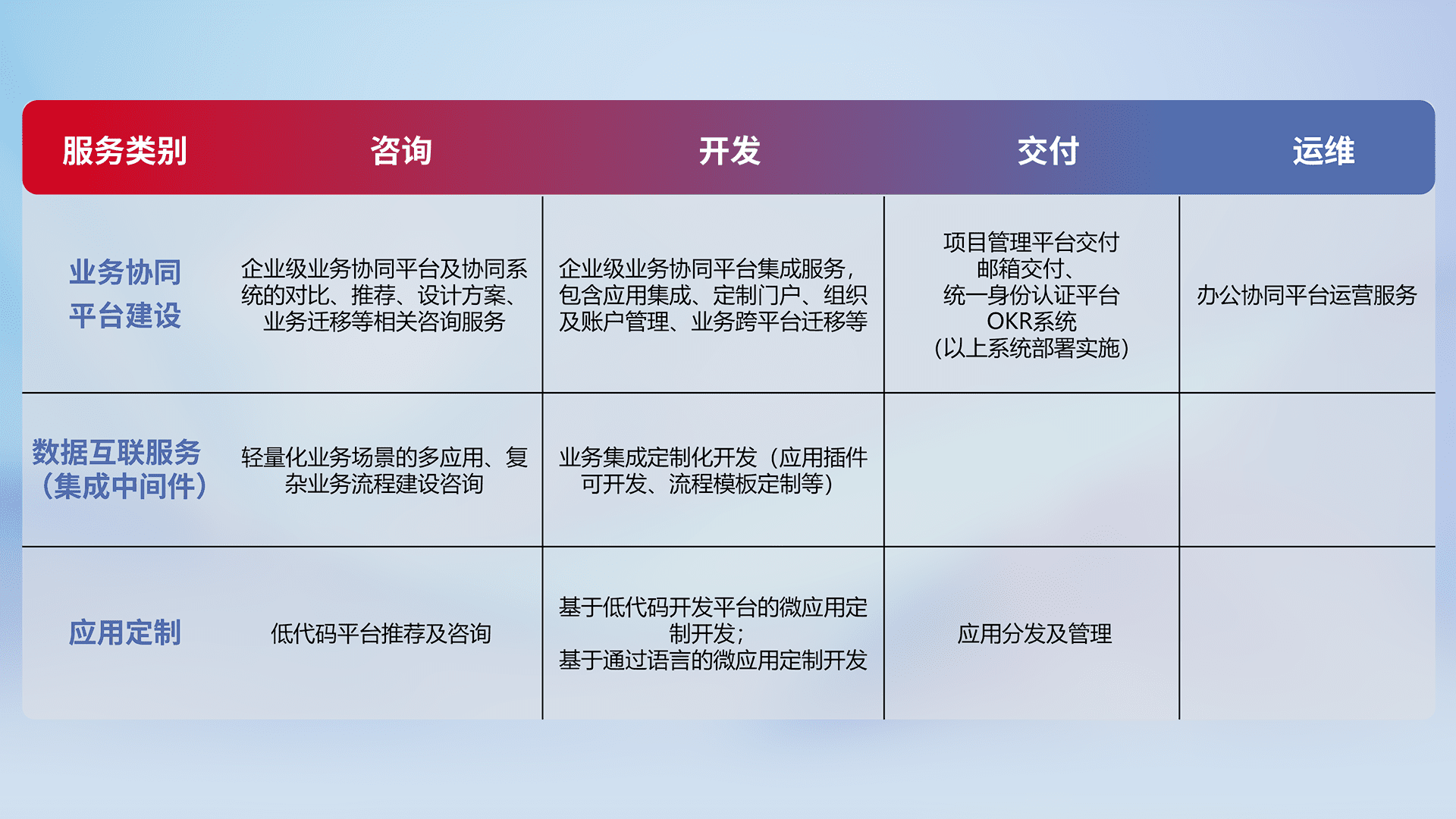 针对钉钉、、企微、、IDaas等平台级产品提供产品的规划、、、、方案、、、交付、、定制化开发等服务,,实现如统一协同办公、、、智能客户服务、、、混合会议管理、、、、智能数据查询、、等业务场景,,,实现数字化转型。。。。