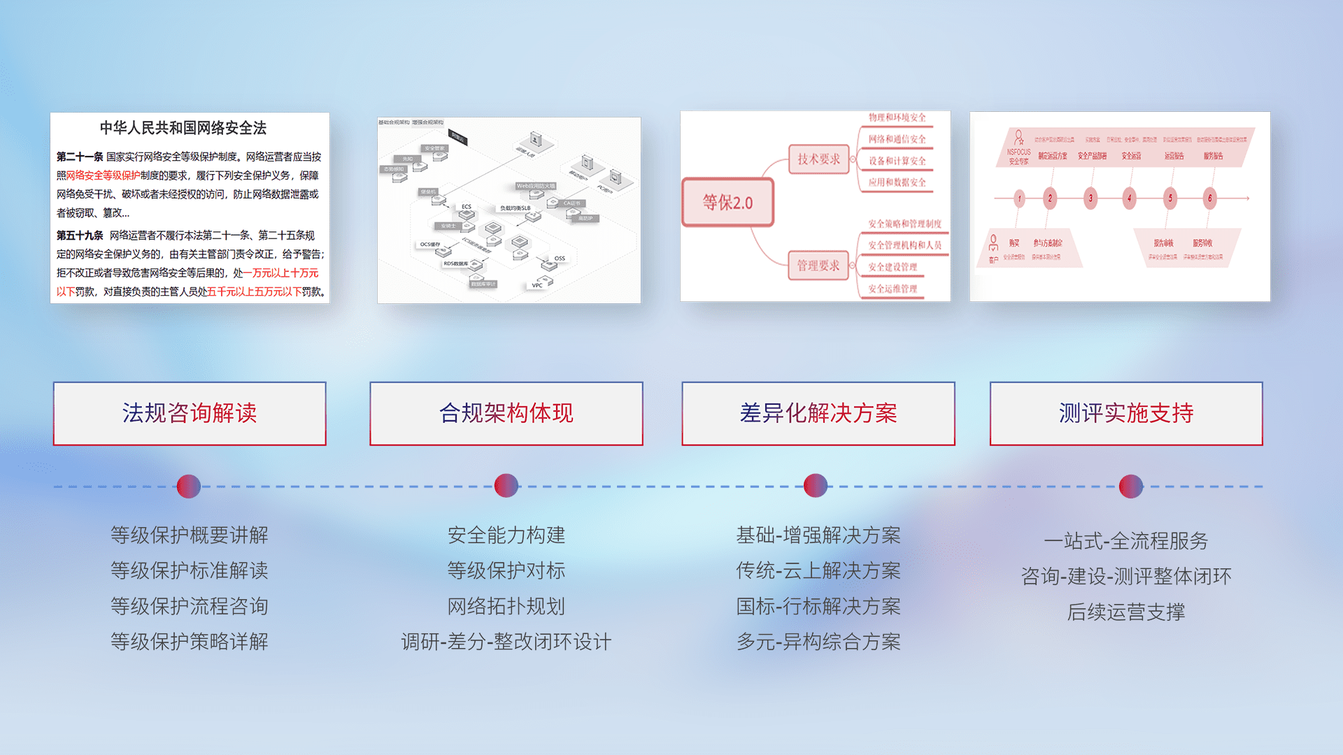 通过专业的法律咨询解读、、、合规架构体现、、差异化解决方案、、、测试实施支持等服务,,,为客户量身打造等保合规体系。。。